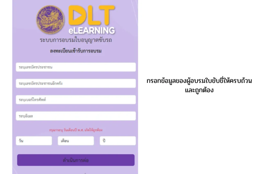 ในส่วนนี้จะเป็นการกรอกข้อมูลของผู้อบรมใบขับขี่เพื่อยืนยันข้อมูลการเข้ารับการอบรมใบขับขี่ออนไลน์ โดยจะประกอบด้วย