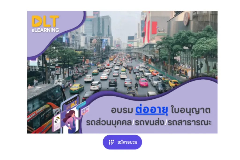 เข้าสู่เว็บไซต์ www.dlt-elearning.com เว็บไซต์ของกรมการขนส่งทางบกสำหรับให้ผู้ที่ต้องการเข้าอบรมใบขับขี่ออนไลน์ จะมีให้เลือกสำหรับคนไทยและชาวต่างชาติ โดยผลการอบรมออนไลน์จะมีอายุ 6 เดือนนับจากวันที่ผ่านการอบรม