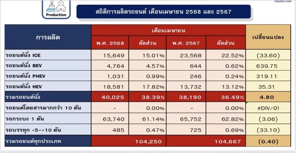 โดยในเดือนเมษายน 2568 ผลิตรถยนต์ 104,250 คัน ลดลง 0.40% โดยผลิตต่ำสุดในรอบ 44 เดือน มียอดขาย 47,193 คัน เพิ่มขึ้น 0.97% ส่งออก 65,730 คัน ลดลง 6.31% ผลิตรถยนต์ไฟฟ้า จำนวน 4,764 คัน เพิ่มขึ้น 639.75% ยอดขายรถยนต์ไฟฟ้า BEV จำนวน 10,981 คัน เพิ่มขึ้น 181.56% และมียอดส่งออกรถยนต์ไฟฟ้า จำนวน 660 คัน
