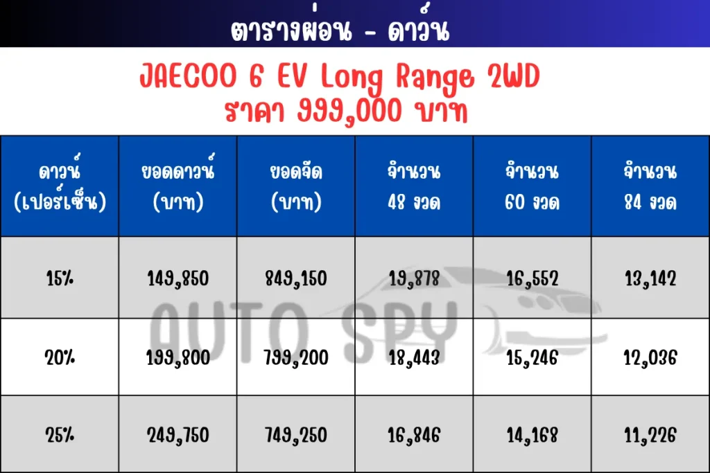 JAECOO 6 EV 2025 ตารางผ่อน