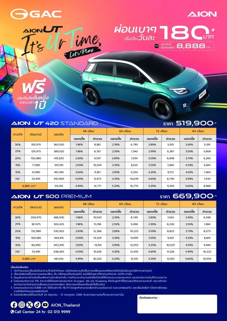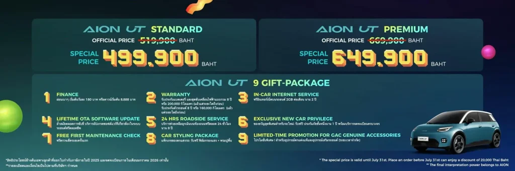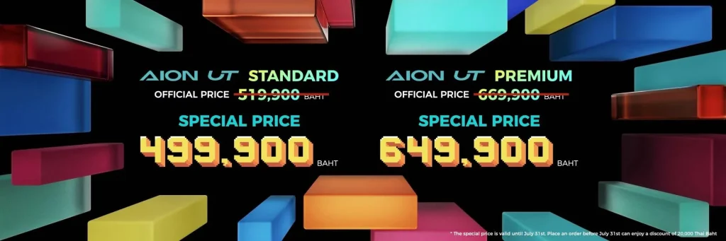 - AION UT Premium ราคา 669,900 บาท (ราคาพิเศษ 649,900 บาท)*