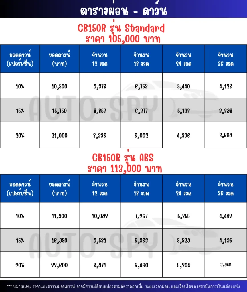 ราคาอย่างเป็นทางการ HONDA CB150R