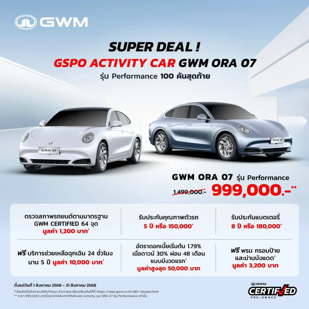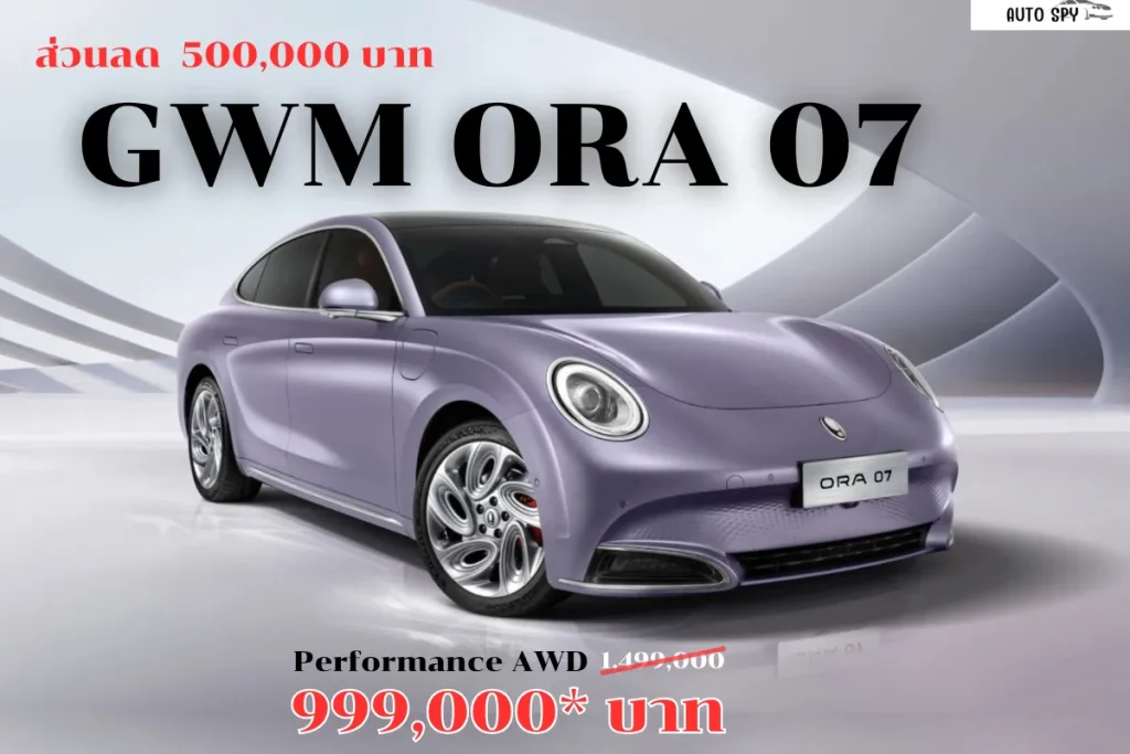 *ORA 07 รุ่น Performance AWD มอบส่วนลดสูงสุด 500,000 บาท จาก 1,499,000 เหลือ 999,000 บาท จำนวนจำกัด 100 คัน